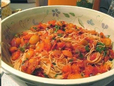 Recipe: 1 lb. fresh cherry tomatoes, cut in half /4 cloves garlic, minced /4 tbsp. extra virgin olive oil /4 sprigs fresh basil /1 cup baby arugula / sea salt and fresh ground black pepper to taste /1 lb. pasta of your choice.